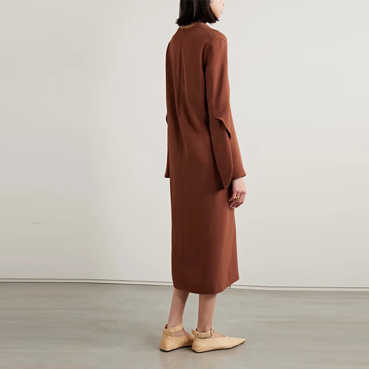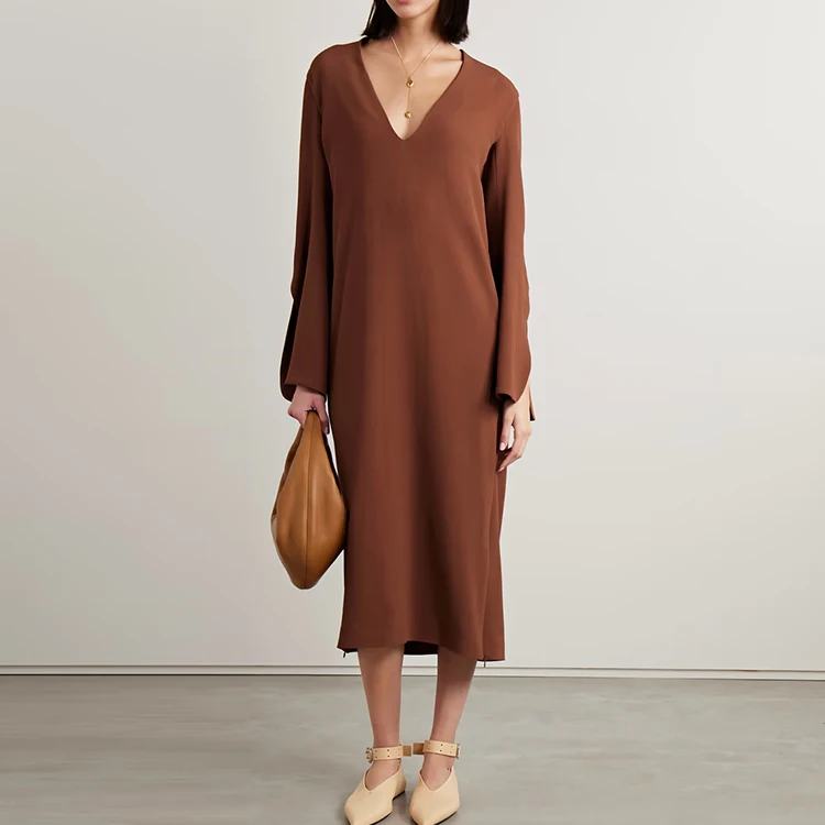 Clothing Manufacturer Custom Spring Autumn Brown V Neck Long Sleeves Elegant Casual Women Dress Wholesale
